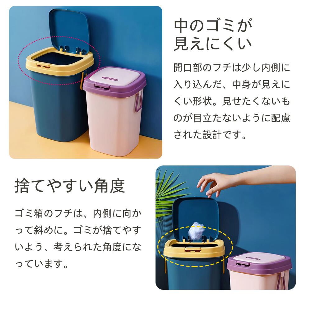 フタは内側に入り込む構造。中のゴミが見えにくく、見られたくないゴミも安心。人が集まるリビングやバスルームにもぴったり。