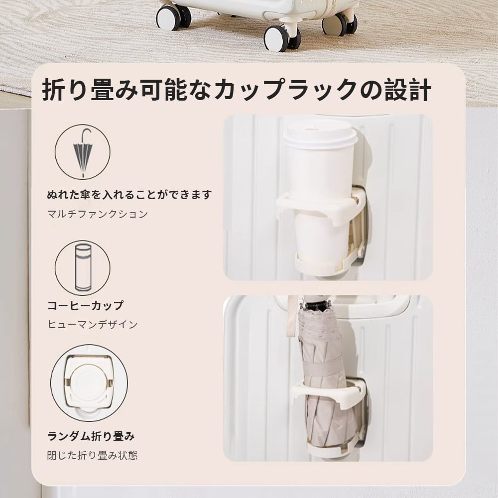 USBポートとカップホルダーを搭載し、移動中でもスーツケースを開けることなくスマホの充電が可能。飛行機内に持ち込めるサイズで、日帰りや1~2泊の小旅行や出張に最適です。