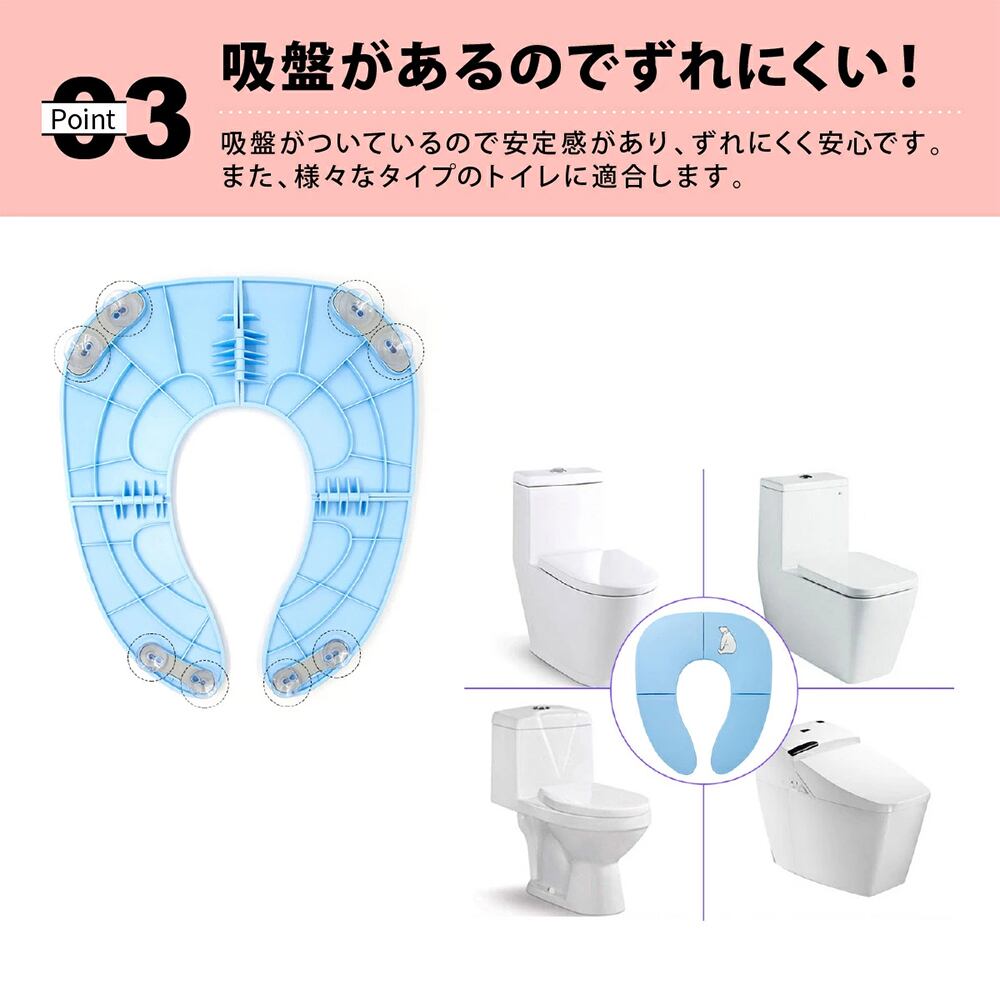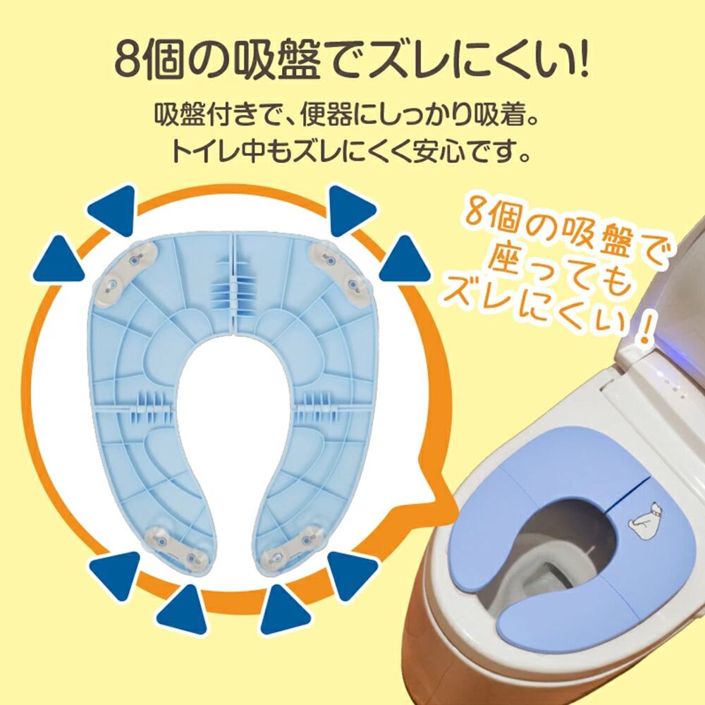 便座の裏側には、合計8つの強力な吸盤を配置。大人用の便座にしっかりと固定できるため、お子様が座った時にグラついたり、ズレたりするのを防ぎます。