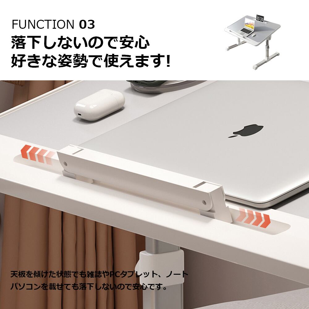 さらに、PCや本のずり落ちを防ぐ「ストッパー」も付いているので、天板を傾けても安心です。