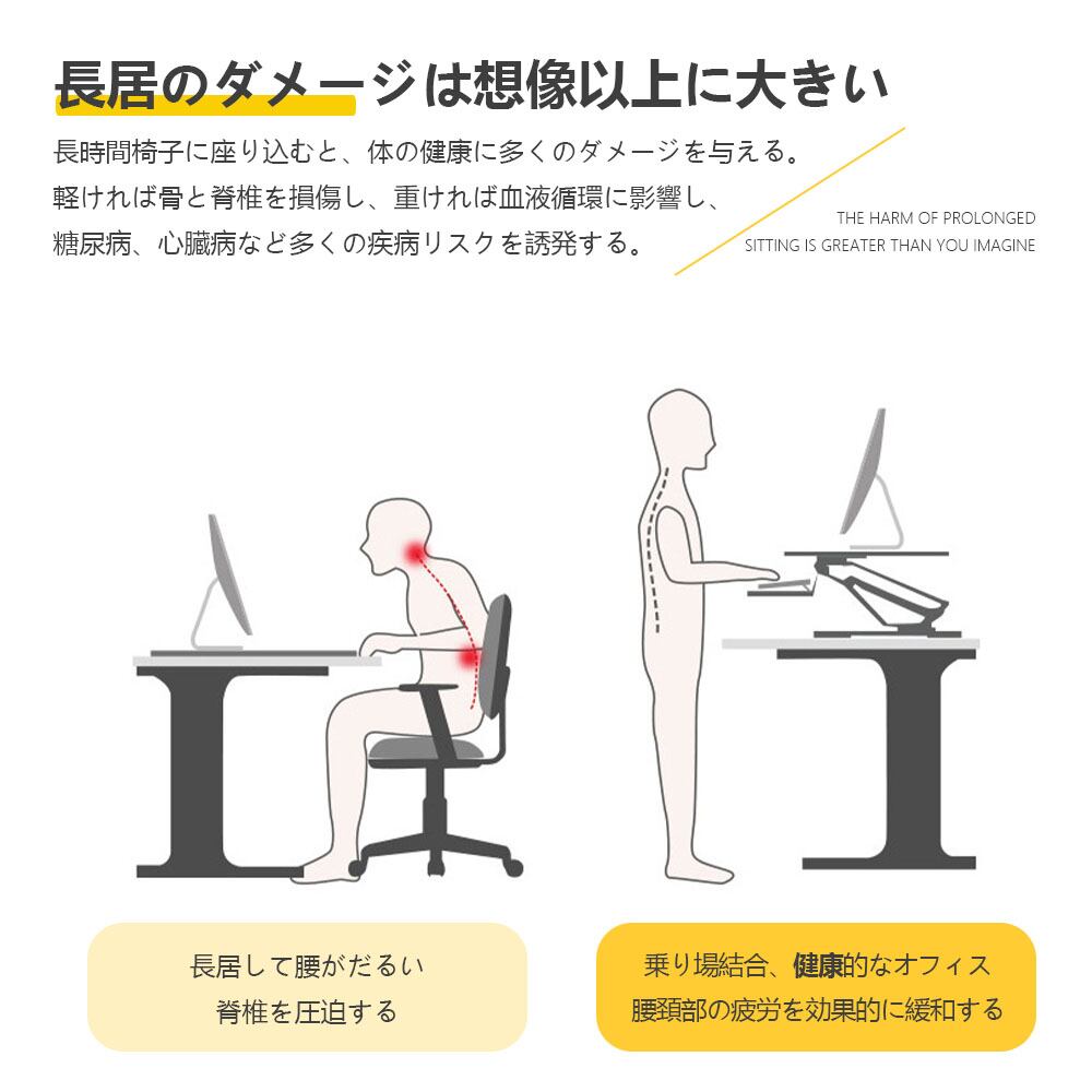 立ち作業と座り作業を自由に切り替えられ、長時間のデスクワークによる肩こりや腰痛、猫背を軽減します。