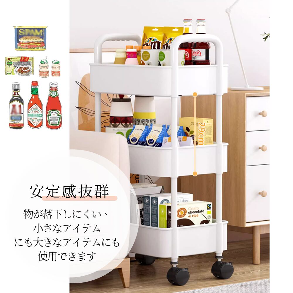 キャスター付きで移動が簡単な三段収納ワゴンです。ロック付きキャスターにより移動・固定がスムーズで、掃除や模様替えの際もストレスなく扱えます。書類、小物、食品ストック、おやつ、雑貨など幅広い用途に対応し、ワンルームからキッチン、オフィスまであらゆる場所で活躍します。かご部分は通気性の良い細かなメッシュ構造で、中身が見やすく整理がしやすい仕様です。軽量ながら丈夫で、日々の収納を快適にする実用性の高いアイテムです。
