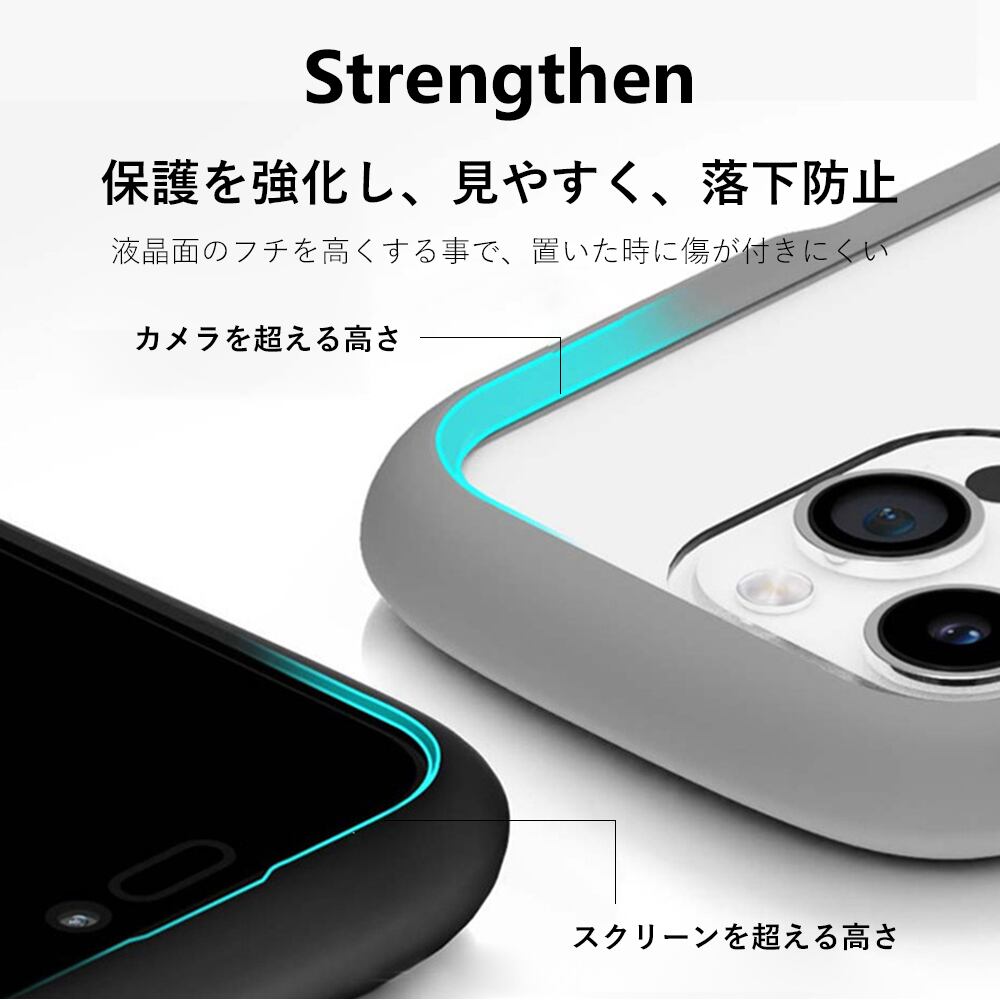 二重構造で鉄壁ガード:柔軟なTPUフレームと、硬度9Hの強化ガラス(クリアタイプ)の二重構造。落下時の衝撃を吸収・分散し、iPhoneをしっかり守ります。