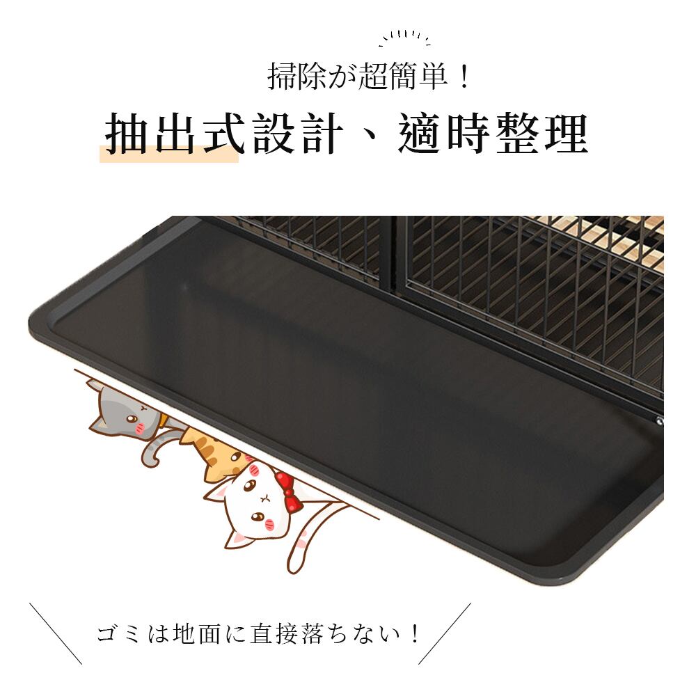 掃除が簡単な引き出しトレー:一番下のトレーは引き出し式。ケージを動かさずに、サッと引き出して丸洗いできるので、いつでも清潔に保てます。
