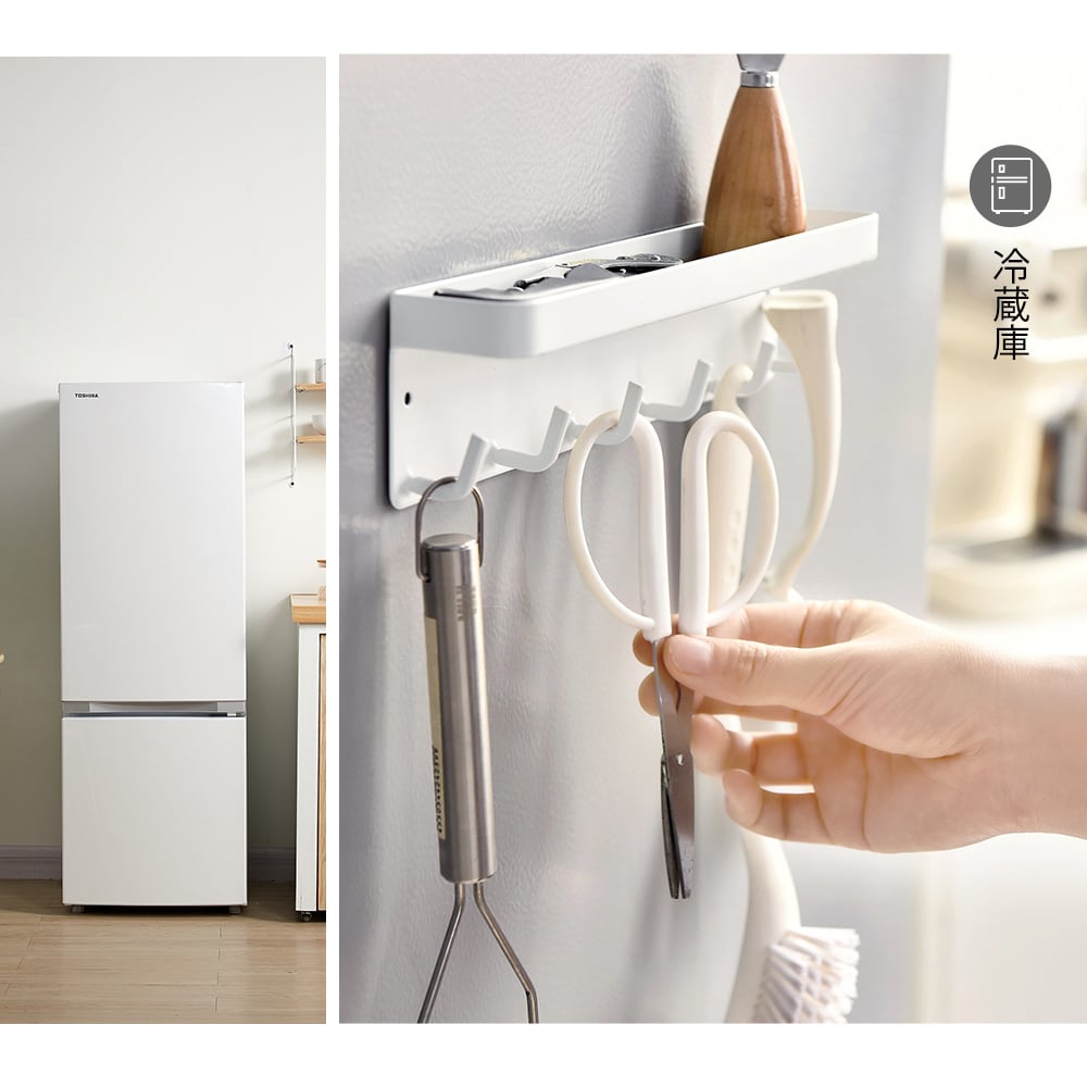 本体は防水性・防錆性に優れたスチール+磁気吸引構造を採用。冷蔵庫、玄関扉、洗濯機、金属キャビネットなどにワンタッチで取り付けでき、壁面を傷つけずに使用できます。上部には小物トレイが付いており、サングラスやリップ、ボールペンなどを置ける“置く+掛ける”の便利な2way収納です。