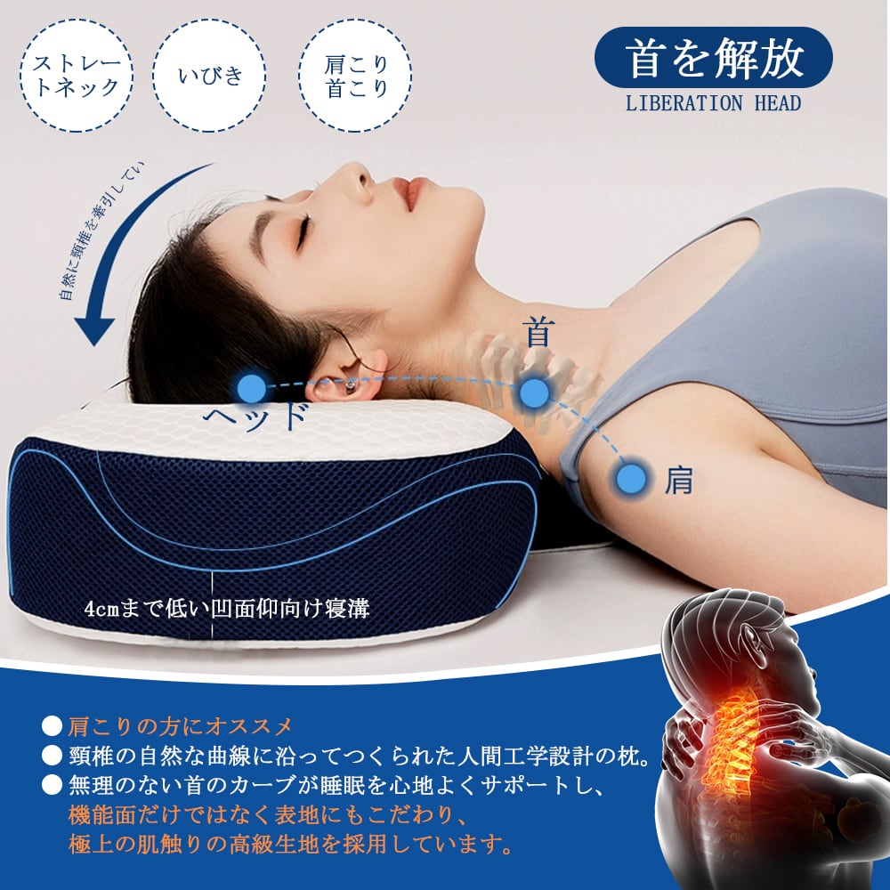 頚椎(首の骨)の自然なカーブをサポートするように設計された、人間工学に基づいたフォルム。無理のない姿勢で眠れることで、首周りの筋肉の緊張を和らげ、スッキリとした目覚めをサポートします。