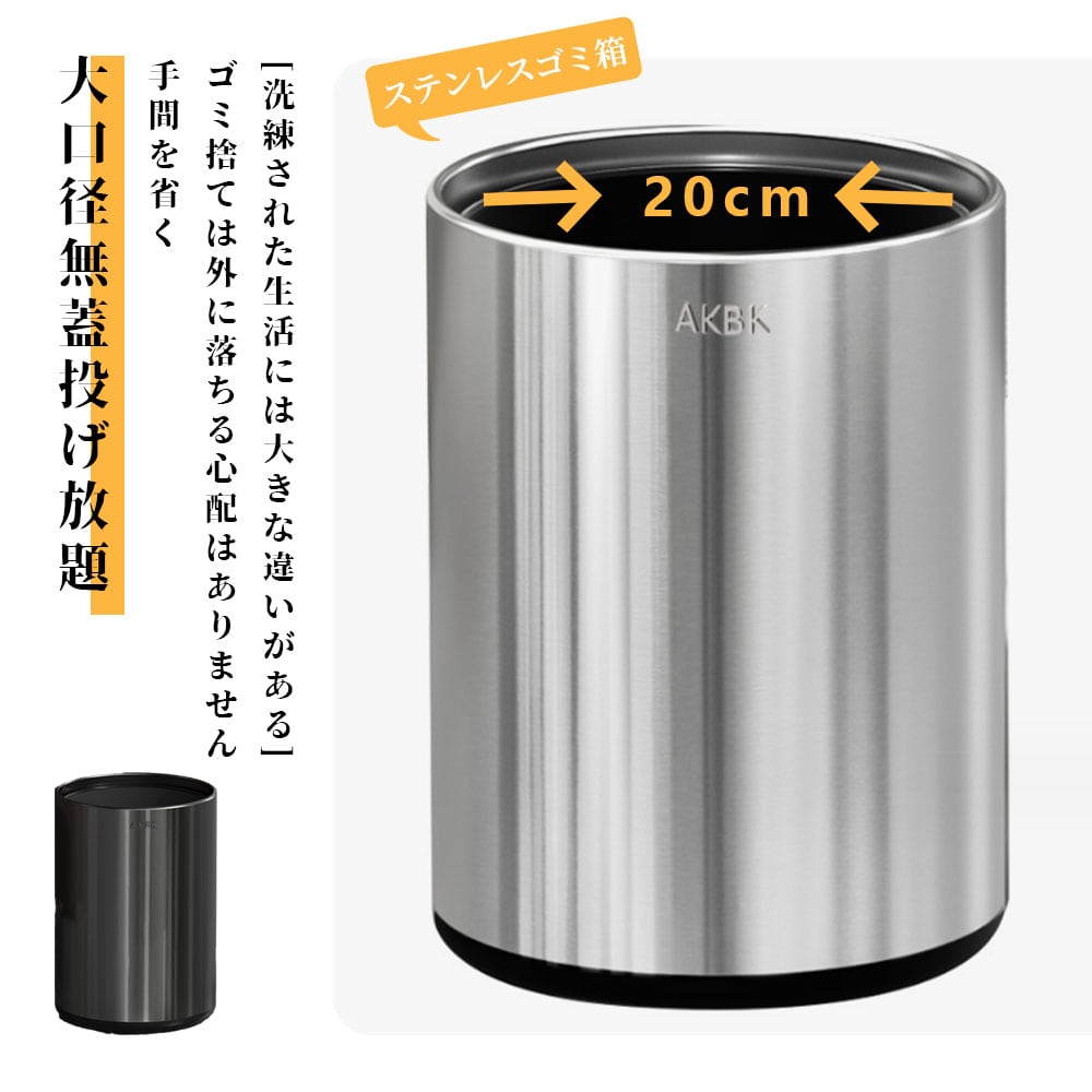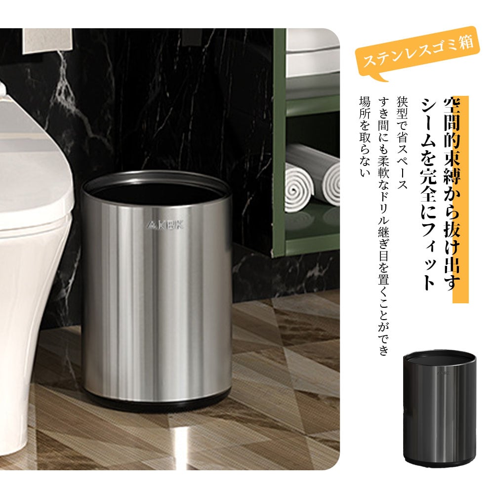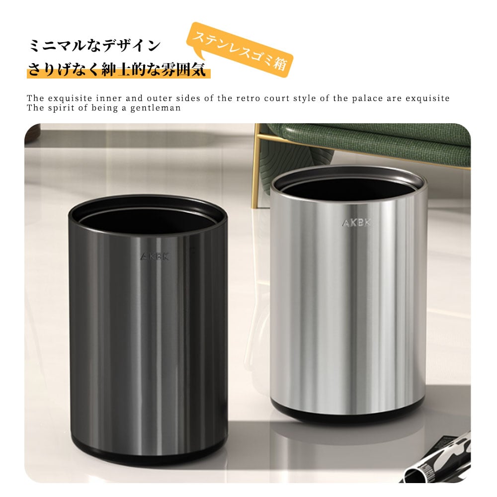 リビング、寝室、キッチン、洗面所などあらゆる場所に馴染むシンプルでスタイリッシュなフォルム。ステンレス特有の光沢は汚れに強く、日常の拭き掃除だけで清潔に保つことができます。カフェのような落ち着いたインテリアを求める方や、生活感を出したくない空間に特におすすめです。
