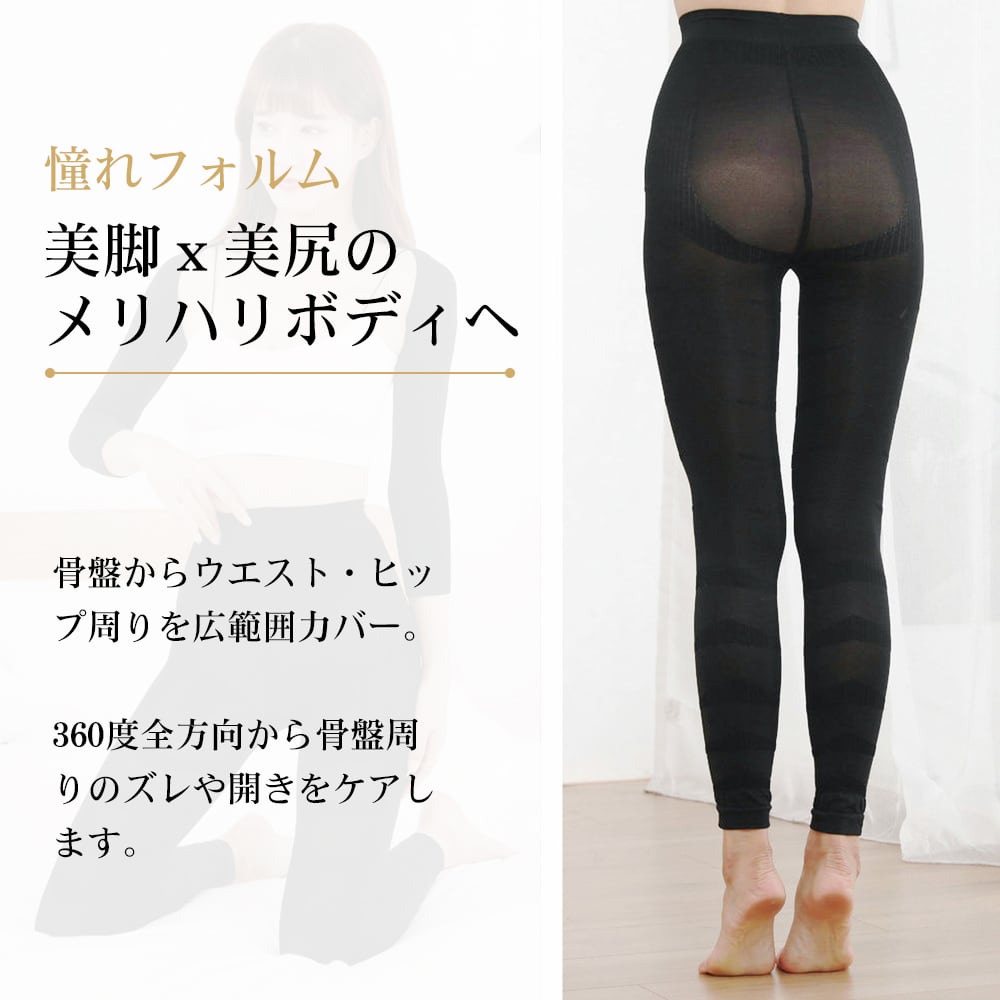ウエスト・太もも・ふくらはぎ・足首までしっかりフィットし、むくみ軽減・骨盤補正・ヒップアップ・姿勢サポートを同時に実現します。