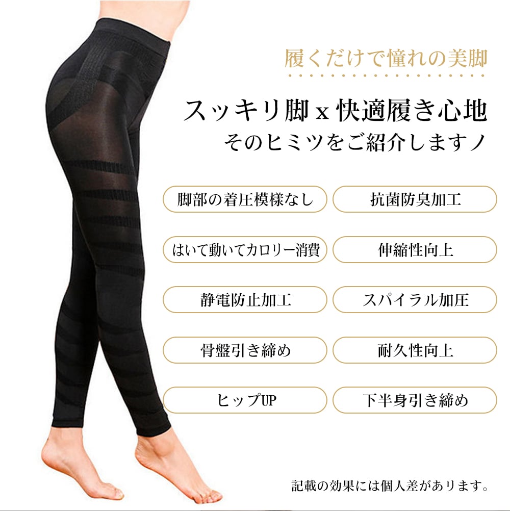 3D構造で脚全体を立体的に包み込み、段階圧力で脚痩せをサポートする強圧タイプの着圧レギンスです。