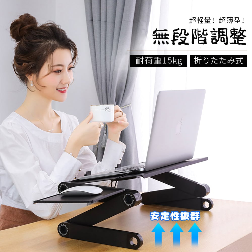 アルミ合金素材でしっかりとした安定感があり、最大15kgまでの耐荷重を実現。無段階の角度・高さ調整が可能で、デスクやソファ、ベッドの上でも自由な姿勢で快適に使用できます。冷却ファンを搭載しているため、長時間の作業でもパソコンの熱を効率的に逃がし、快適な作業環境を保ちます。