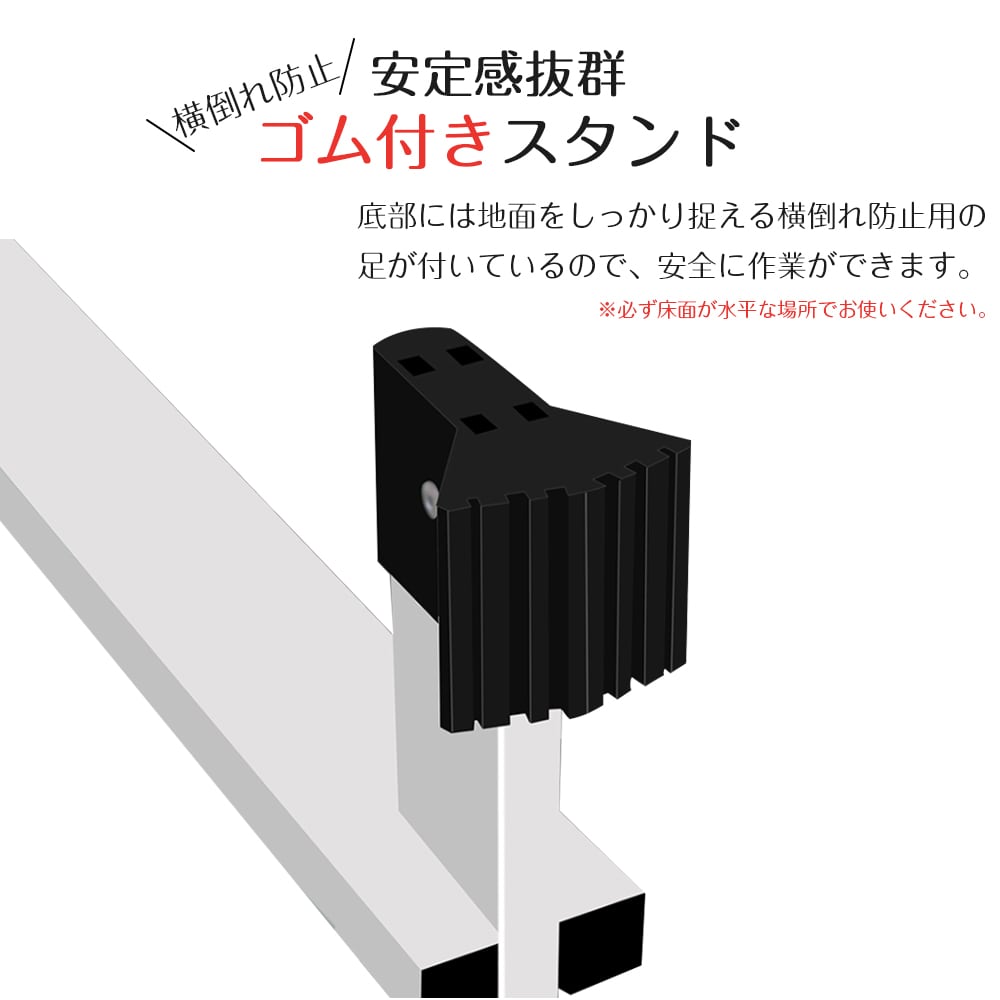 耐荷重は約150kgで、頑丈かつ安全。横倒れ防止のゴム付きスタンドとワンタッチロック機構により、作業時も安定感抜群です。アルミ製なので軽量で錆びにくく、使用後はコンパクトに折り畳めるため車や倉庫での収納もスムーズ。