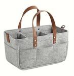 柔らかく丈夫なフェルト素材(人造ウール)を使用。赤ちゃんが触れても安心で、家具を傷つける心配もありません。レザー調のハンドルがアクセントとなり、どんなお部屋のインテリアにも優しく馴染みます。