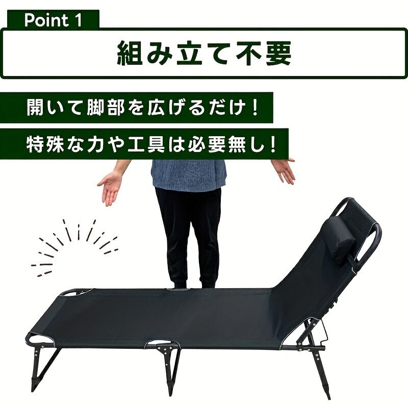 特徴: 組み立て不要、折りたたみ式、4段階リクライニング、枕付き、軽量
