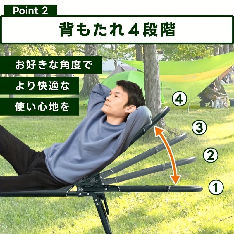 ・お昼寝モード(④段階目/フラット): 全身を伸ばして、まるでベッドのような寝心地。地面の凹凸や冷気を感じさせず、朝までぐっすり快眠をサポートします。