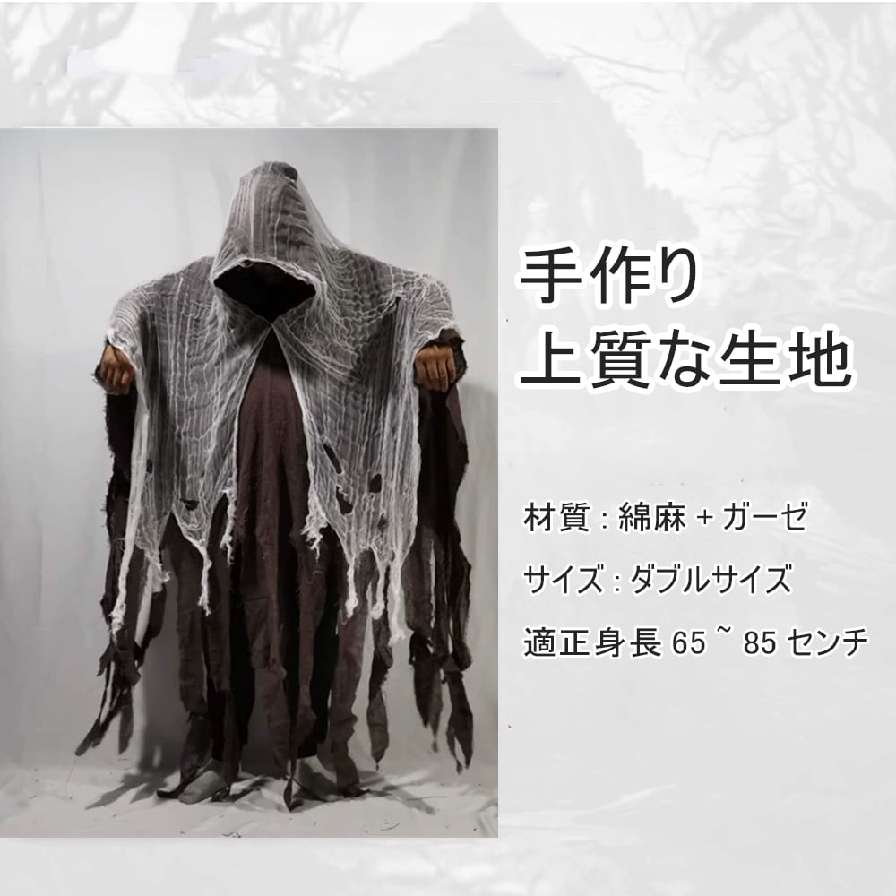 手作りならではの温かみと、綿麻とガーゼを組み合わせた上質な生地が、リアルで不気味な質感を再現。垂れ下がったボロボロの布が風に揺れる様子は、まるで本物のゴーストが現れたかのよう。その圧倒的な存在感で、訪れるゲストを驚かせること間違いなしです。