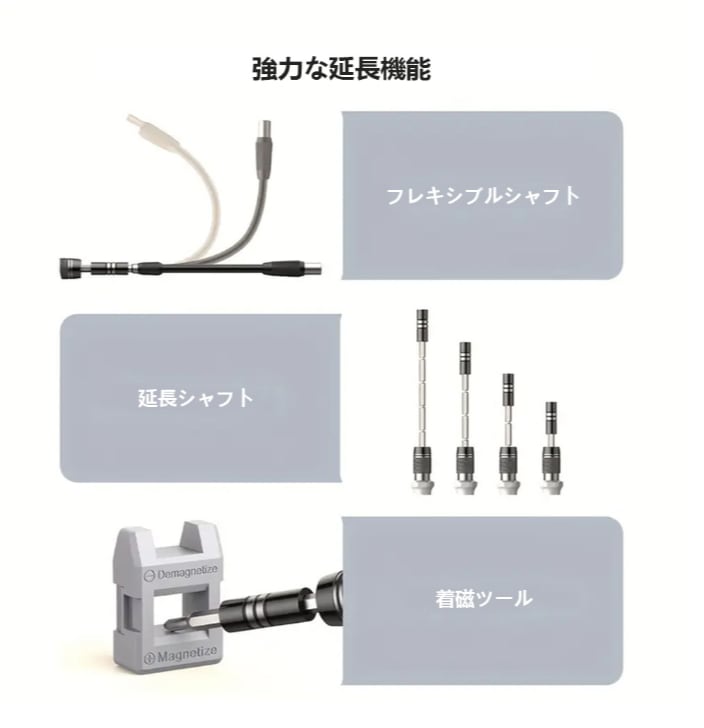 ドライバー本体はアルミグリップ仕様で、手にしっかりフィットし、滑りにくく安定した作業が可能です。延長シャフトやフレキシブルシャフト、着磁ツールが付属しており、狭い場所や奥まったネジにも対応できます。ネジの脱落を防ぐ磁力サポート機能により、作業効率の向上にも貢献します。