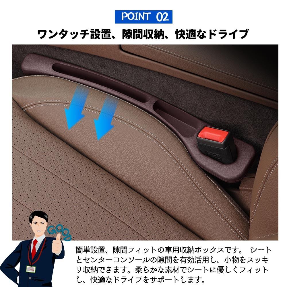 本商品は、運転席および助手席のシートとセンターコンソールの隙間を埋めるために設計された、自動車用シートギャッププラグの2個セットです。走行中にスマートフォン、鍵、硬貨、カード、駐車券などの小物がシートの隙間に落ちてしまうストレスを軽減し、車内をすっきりと保つことができます。