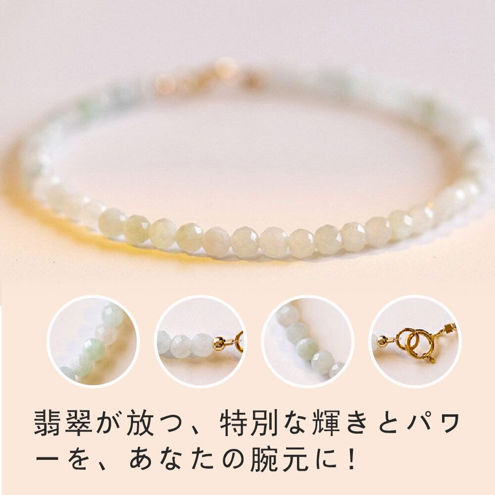 翡翠を使用した超細身タイプの天然石ブレスレットです。6mmサイズの翡翠を64面カットで仕上げることで、控えめながらも手元で繊細な輝きを放つデザインになっています。シンプルで主張しすぎないため、日常使いはもちろん、アクセサリーを重ね付けしたい方にも取り入れやすいブレスレットです。