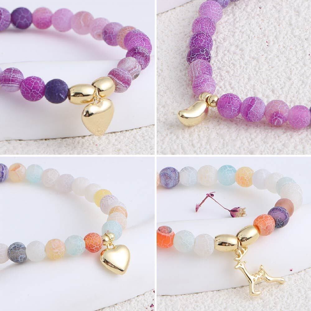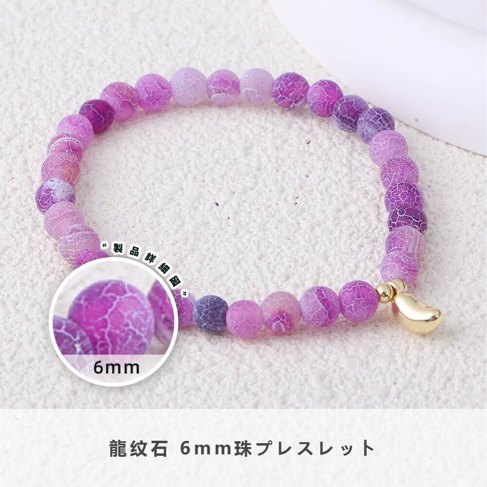 龍紋瑪瑙(ドラゴンアゲート)を使用した、8mmサイズの天然石ブレスレットです。表面に施されたクラック加工によって、まるで龍の鱗のような独特の模様が現れ、一本ごとに異なる表情を楽しめるデザインに仕上がっています。カラフルな色合いが手元を明るく彩り、シンプルな服装のアクセントとしても映えるブレスレットです。