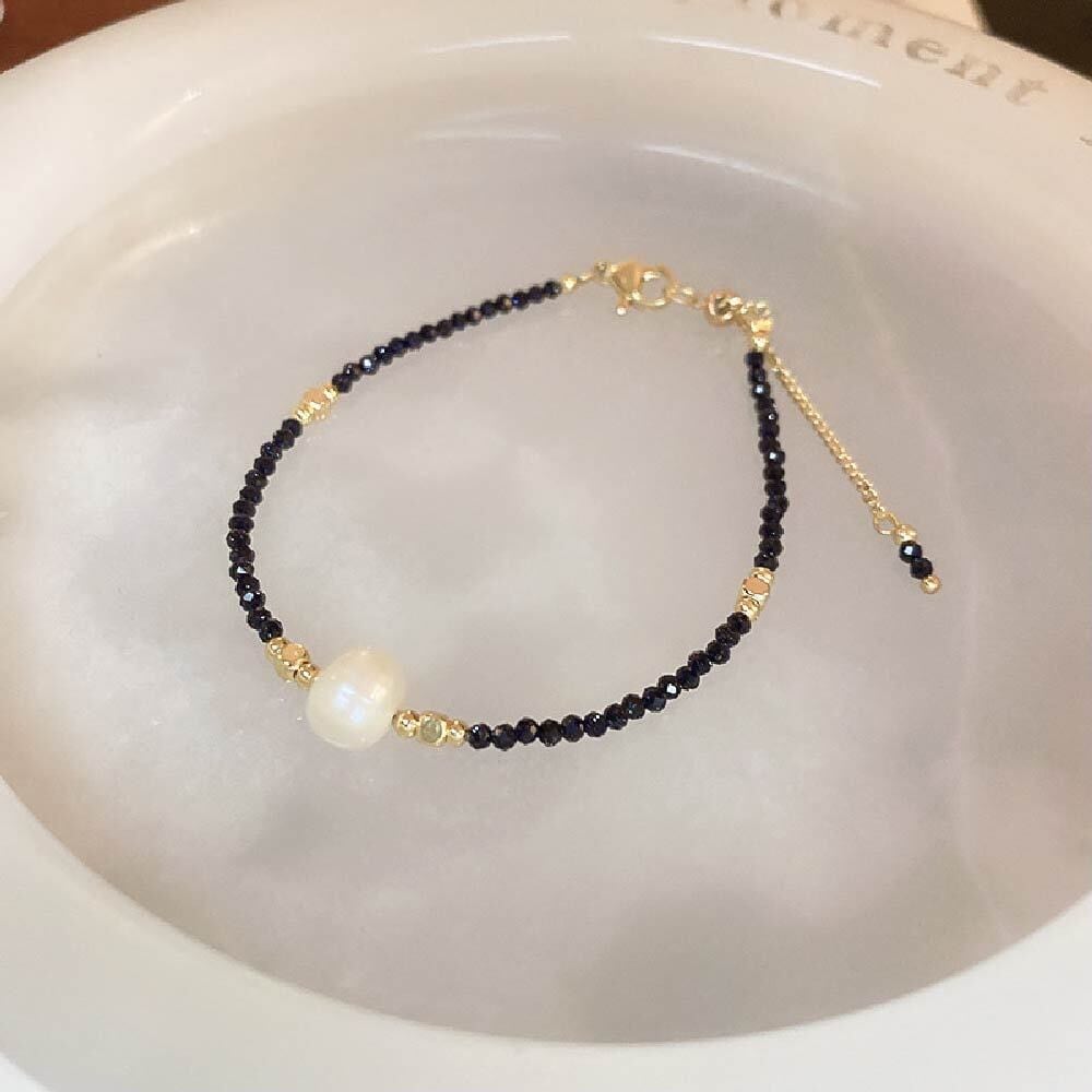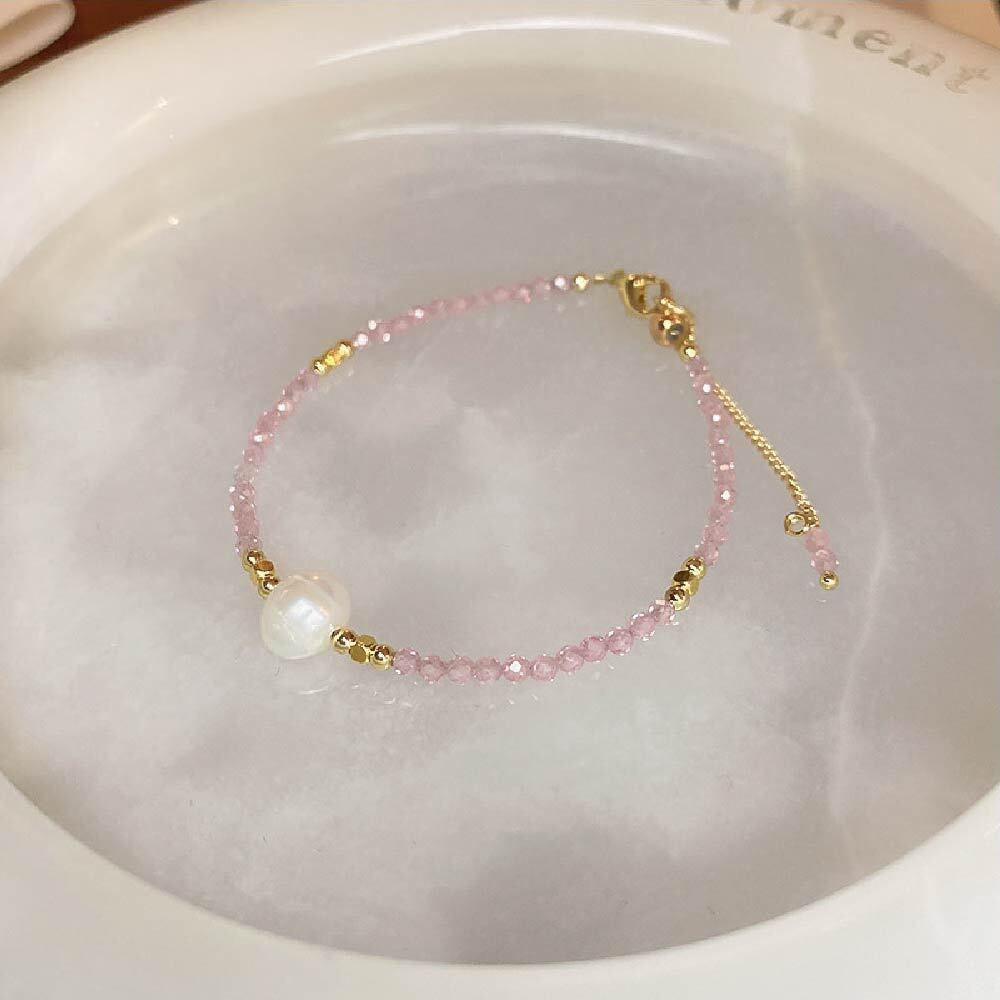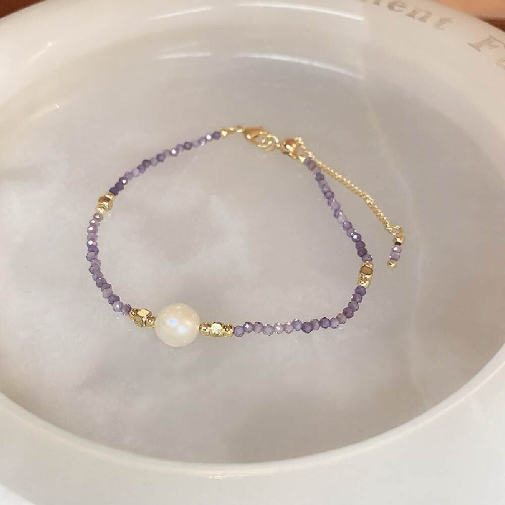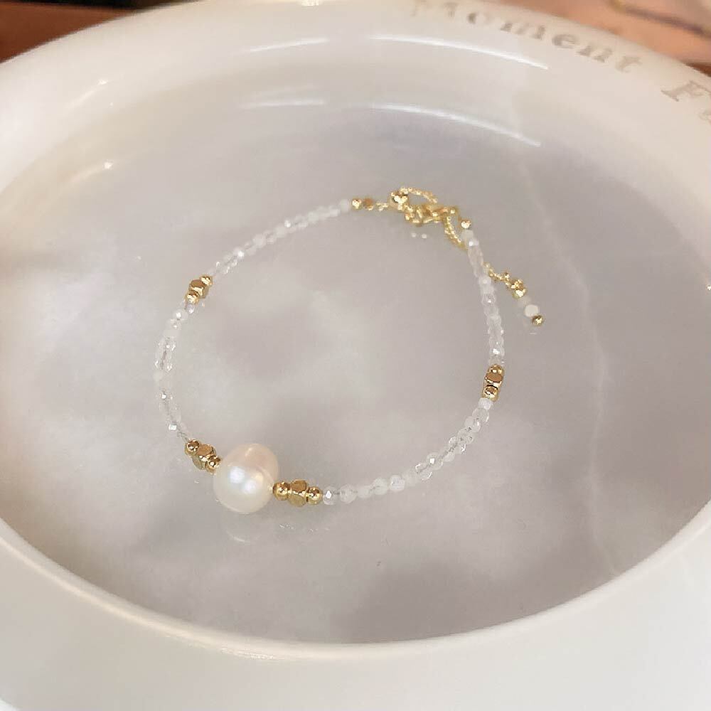 3mmサイズの小粒天然石を連ねた、繊細で女性らしい印象のブレスレットです。細かなカットが入ったビーズが光を受けてさりげなくきらめき、手元を上品に見せたい方に向いたデザインです。粒が小さいため主張しすぎず、普段の服装やオフィススタイルにも自然に馴染みます。アクセサリーを「つけている感」を出しすぎたくない方、さりげない華やかさだけ足したい方に使いやすい一本です。
