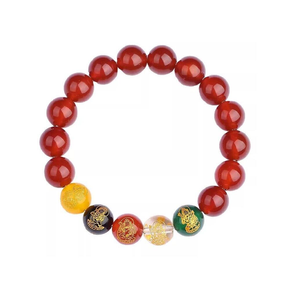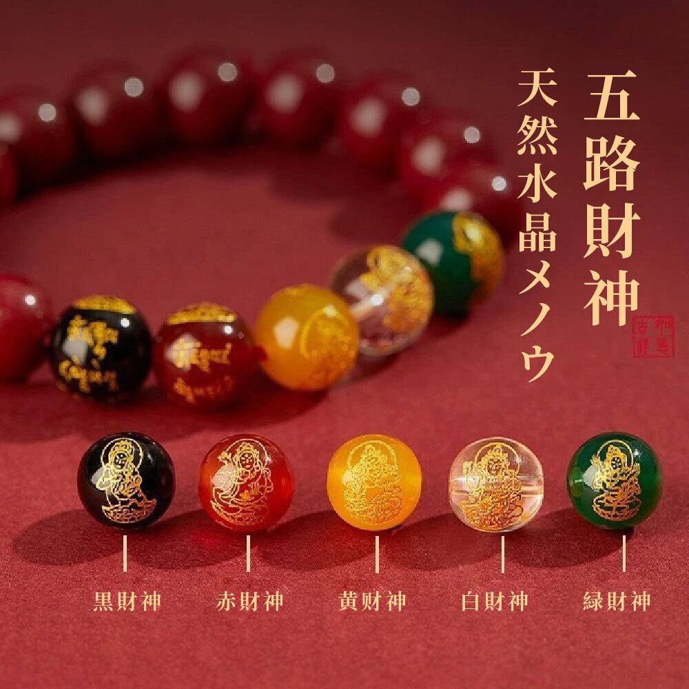 紅瑪瑙または黒瑪瑙をベースに、五路財神モチーフのビーズを組み合わせた存在感のある天然石ブレスレットです。8mmまたは10mmサイズの丸玉を使用しており、手元にしっかりとしたボリューム感を与えながら、力強く落ち着いた印象に仕上がっています。伝統的なモチーフと天然石の組み合わせにより、お守り感とアクセサリー性の両方を兼ね備えたデザインです。
