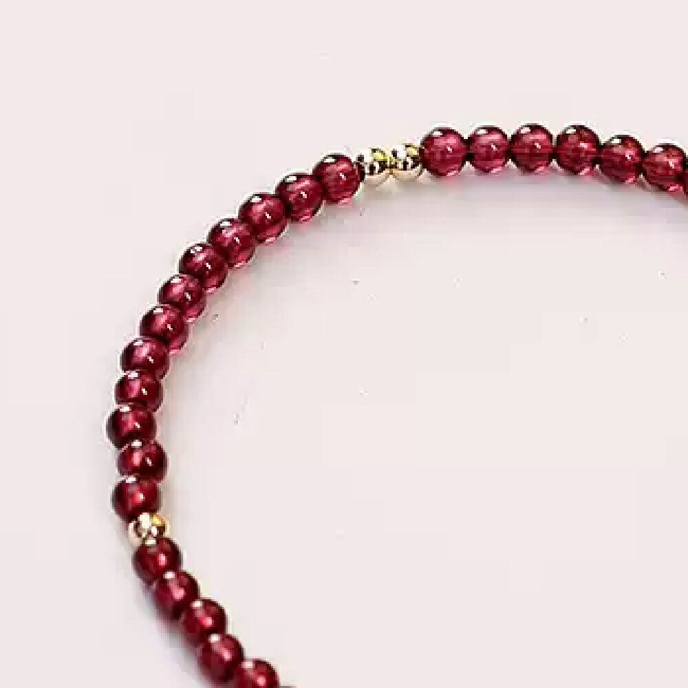 深みのあるワインレッドカラーが美しいガーネットを使用した、4mmサイズの極細天然石ブレスレットです。細身のシルエットが手首をすっきり見せ、主張しすぎないのに上品な存在感を出せるため、アクセサリーを控えめに楽しみたい方に向いた一本です。小粒の天然石を丁寧に連ねたデザインは、普段のコーディネートに自然に馴染み、きれいめにもカジュアルにも合わせやすいのが特徴です。