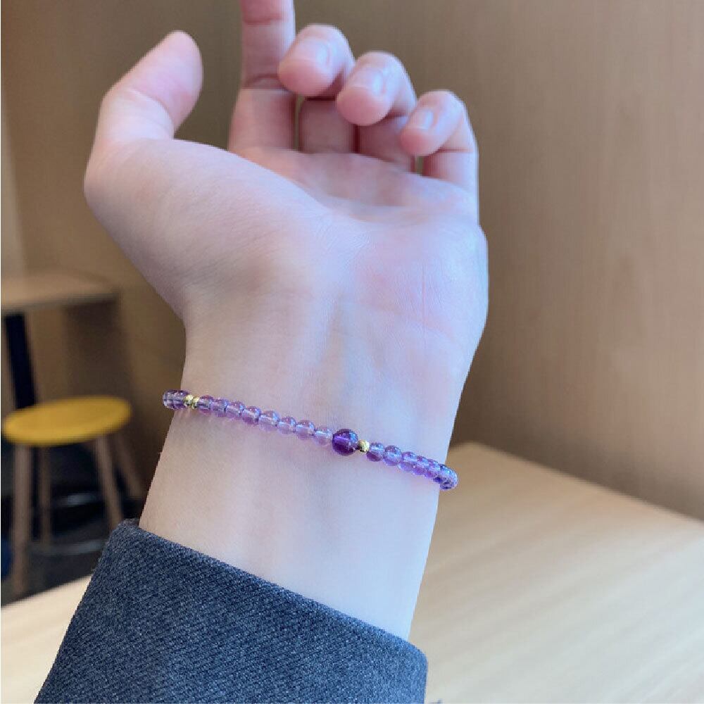 シンプルで洗練されたデザインは、年齢を問わず使いやすく、自分用のお守りアクセサリーとしてはもちろん、誕生日や記念日、ちょっとした贈り物としても選ばれやすいブレスレットです。日常に静かな彩りを添えてくれる、女性向けの天然アメジストブレスレットです。