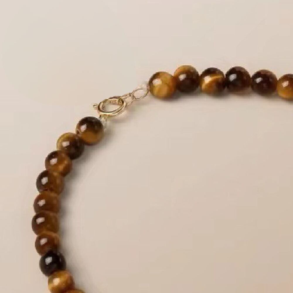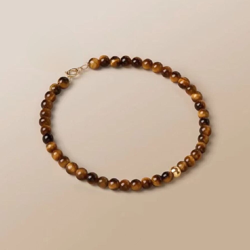 こちらは、6mmサイズの天然イエロータイガーアイを使用した、落ち着きと高級感を兼ね備えたデザインの天然石ブレスレットです。タイガーアイ特有の縞模様と光沢感が美しく、光の当たり方によって表情が変わるため、シンプルながらも奥行きのある手元を演出します。
