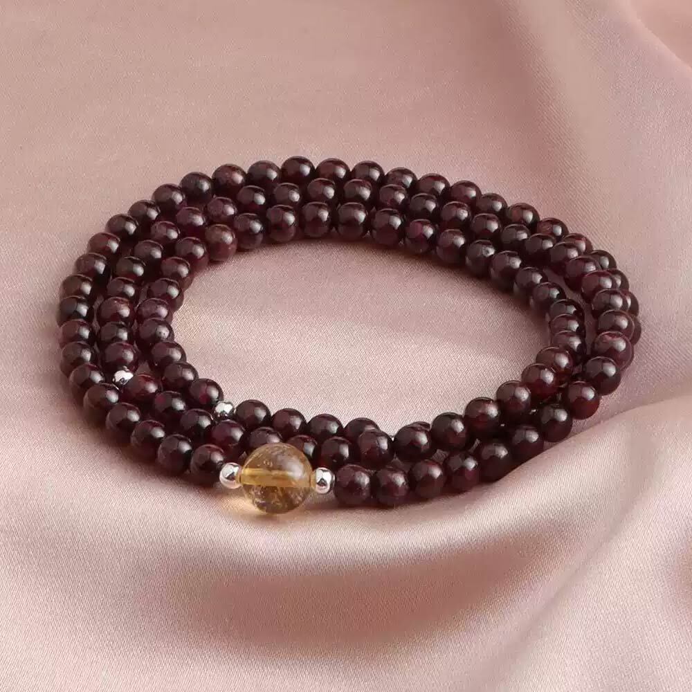 こちらは、4mmサイズの天然ガーネットを使用した、女性向けの多連タイプ天然石ブレスレットです。深みのある赤褐色が特徴のガーネットを贅沢に連ね、多重に巻いて着用することで、手元に自然なボリュームと華やかさを与えるデザインに仕上げています。落ち着いた色味のため派手になりすぎず、大人っぽい印象を演出します。