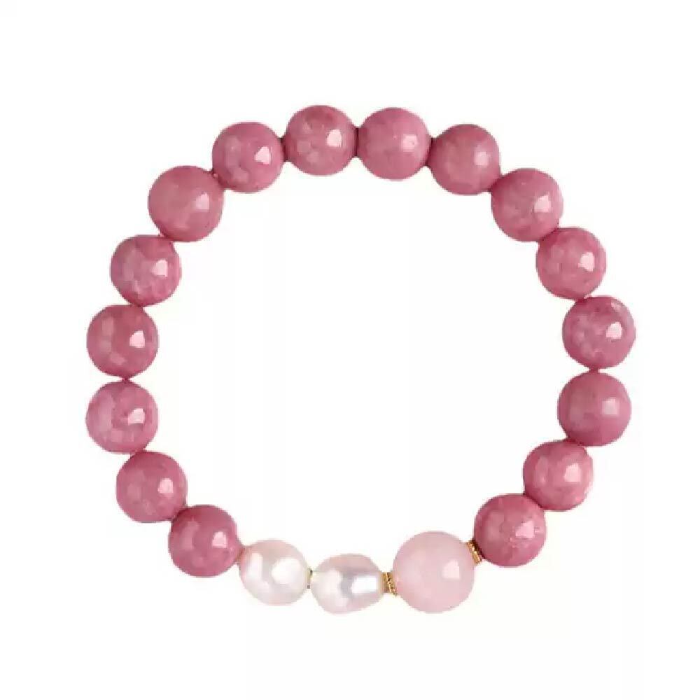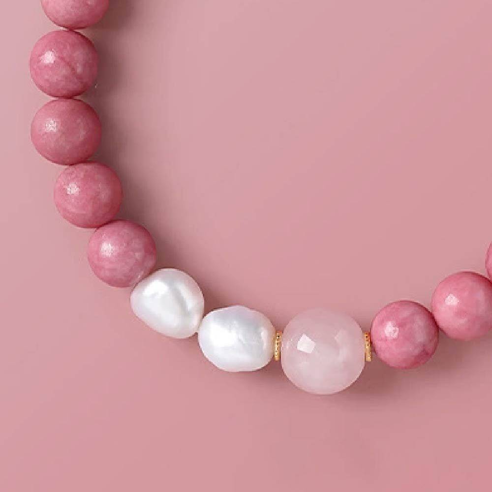 こちらは、10mmサイズの天然ロードナイトをベースに、ローズクォーツと淡水パールを組み合わせた女性向けの天然石ブレスレットです。全体を優しいピンクトーンでまとめつつ、異なる質感の天然石を組み合わせることで、フレンチスタイルを意識した上品で洗練された印象に仕上げています。