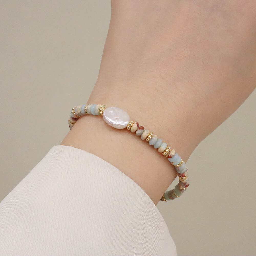 ストロベリークォーツは、淡くやさしいピンクカラーと透明感が特徴で、肌なじみが良く、手元を柔らかく見せてくれます。そこに自然石を組み合わせることで、人工的になりすぎず、天然素材ならではの温かみと個体差を楽しめるブレスレットとなっています。