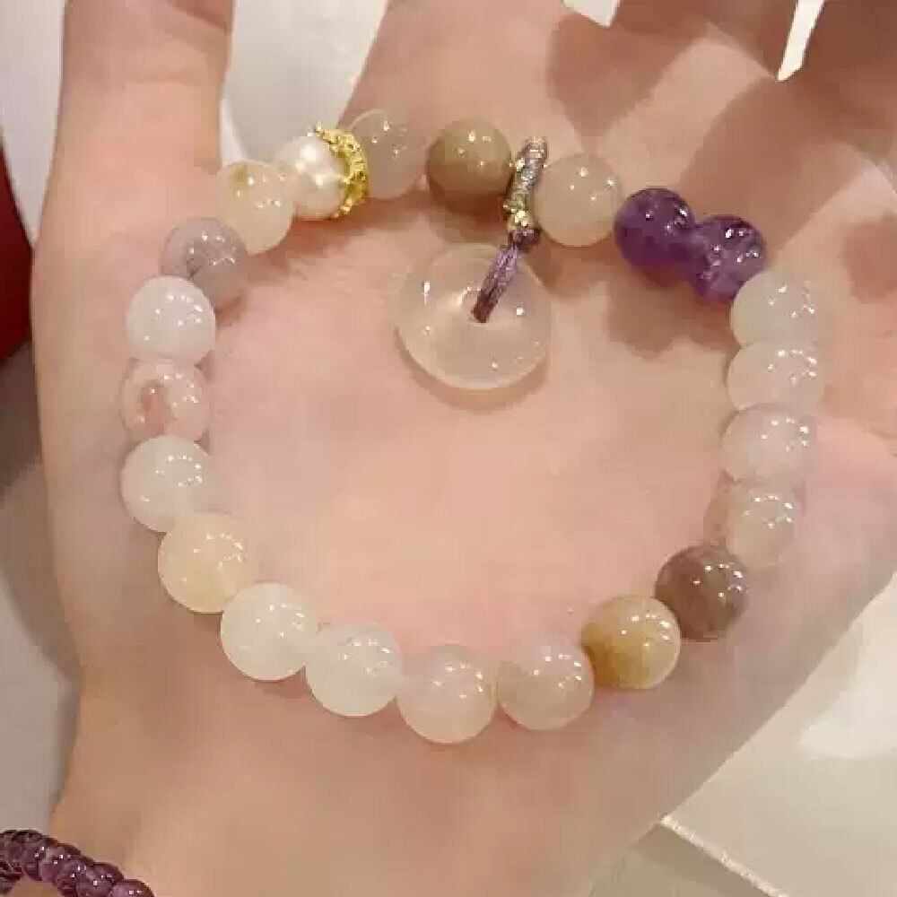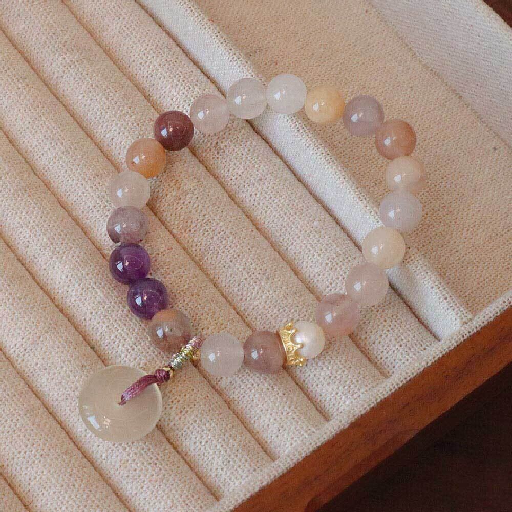 こちらは、8mmサイズの天然石を使用し、パープルジェイドをメインに新中式(ニュー・チャイニーズ)テイストを取り入れた平安扣(へいあんこう)デザインの天然石ブレスレットです。中央には存在感のある平安扣モチーフを配置し、伝統的な要素と現代的なデザインを融合させた、上品で洗練された印象に仕上げています。