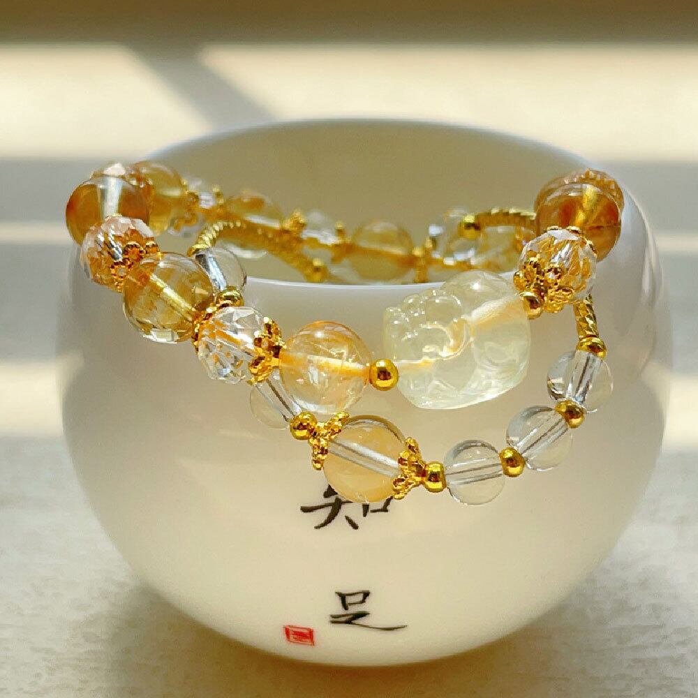 こちらは、8mmサイズの天然シトリン(黄水晶)を使用し、彫刻が施された貔貅(ひきゅう)モチーフを組み合わせたダブルチェーン仕様の天然石ブレスレットです。透明感のあるレモンカラーのシトリンを基調に、ゴールドカラーのチェーン要素を加えることで、華やかさと上品さを併せ持つデザインに仕上げています。