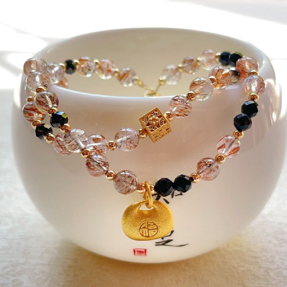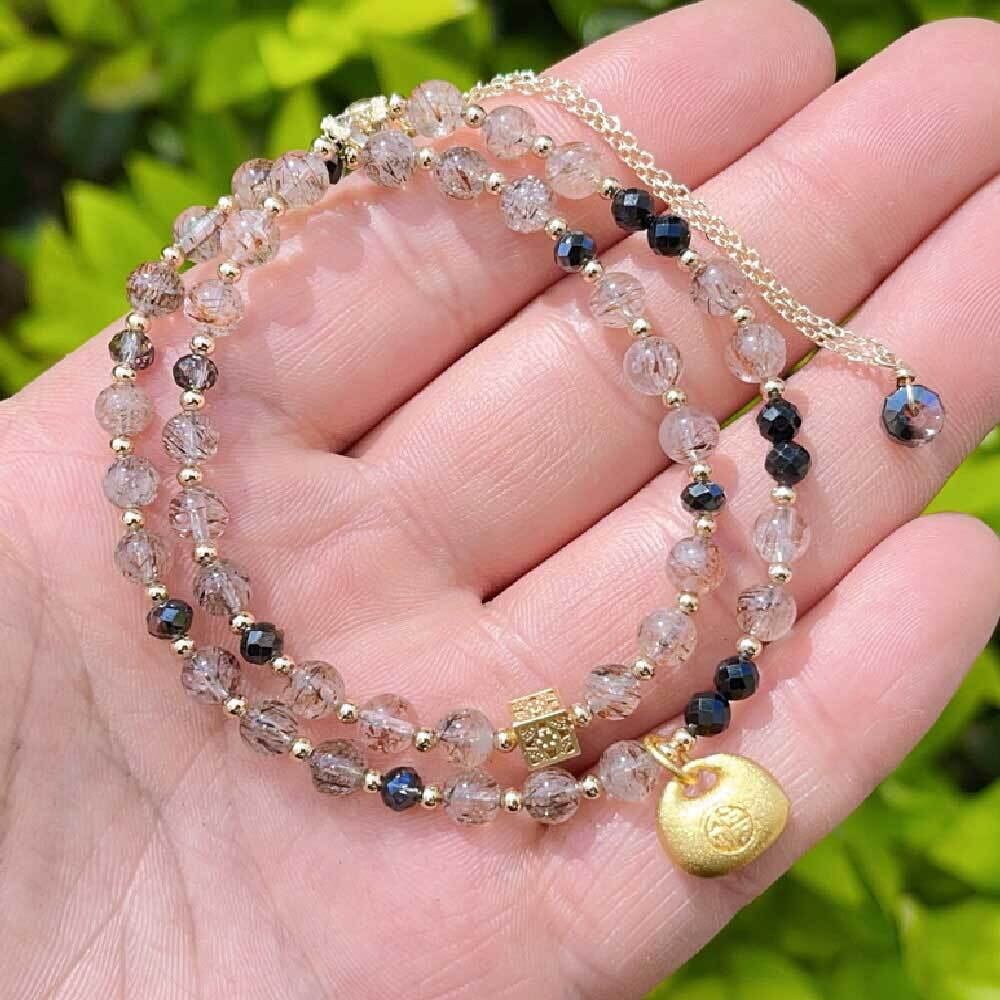こちらは、6mmサイズの天然石を使用し、黒金超七(こくきんちょうなな)を中心に構成した二重層デザインのビーズブレスレットです。透明感のあるベースストーンに、黒色と金色のアクセントビーズを組み合わせることで、落ち着きと華やかさを併せ持つ印象に仕上げています。