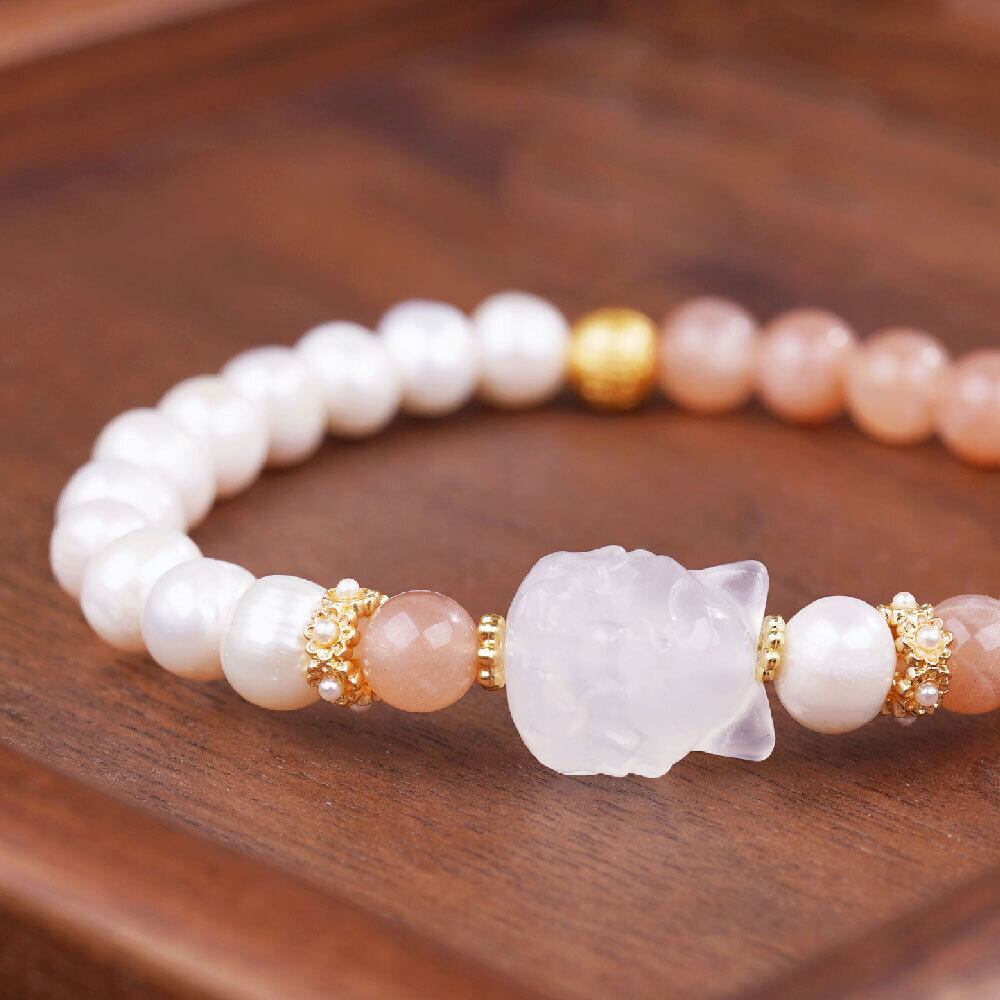 全体として柔らかな色調でまとめられているため、季節を問わず使いやすく、自分用としてはもちろん、意味合いやモチーフを重視したギフトとしても選ばれやすいブレスレットです。天然石の質感と彫刻デザインを楽しみたい方におすすめです。